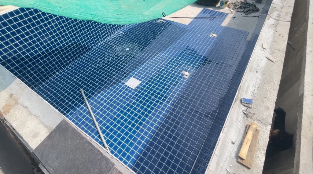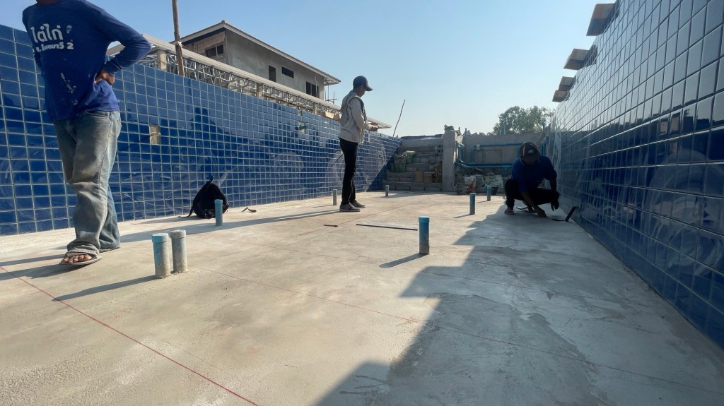 ถึงขั้นตอนปูกระเบื้อง พื้นผนังสระ ที่นั่งสปา